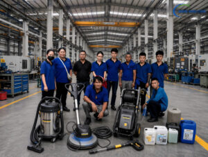 Để hiện thực hóa mục tiêu “đè bẹp” các vết bẩn cứng đầu một cách nhanh chóng mà không làm hư hại cơ sở vật chất của xưởng, Hương Giang Clean đầu tư cực kỳ bài bản vào hệ thống khí tài hiện đại: