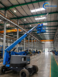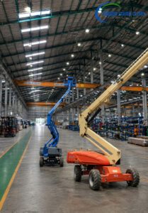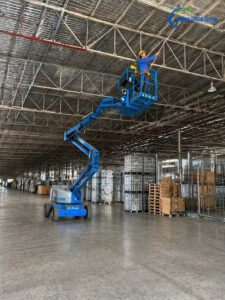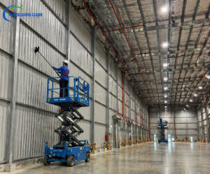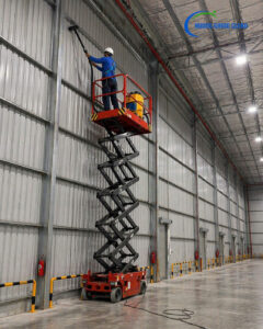 - Xe nâng người tự hành (Scissor Lift / Boom Lift): Đảm bảo an toàn tuyệt đối cho công nhân khi quét mạng nhện và lau chùi hệ thống xà gồ ở độ cao từ 10m – 20m. Giải pháp này an toàn hơn rất nhiều so với việc bắc giàn giáo truyền thống.