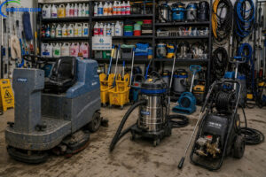 Tập kết đầy đủ máy móc: xe nâng, máy chà sàn, máy hút công nghiệp, hóa chất chuyên dụng.