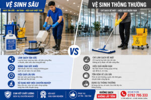 - Chi phí đầu tư: Tự làm tưởng rẻ nhưng đắt vì phải tự bỏ số vốn lớn mua máy hút bụi, máy chà sàn và chịu chi phí bảo trì máy hằng tháng. Thuê dịch vụ giúp tối ưu tuyệt đối, bạn chỉ trả tiền cho diện tích thực tế được làm sạch, không tốn bất kỳ chi phí khấu hao máy móc nào.