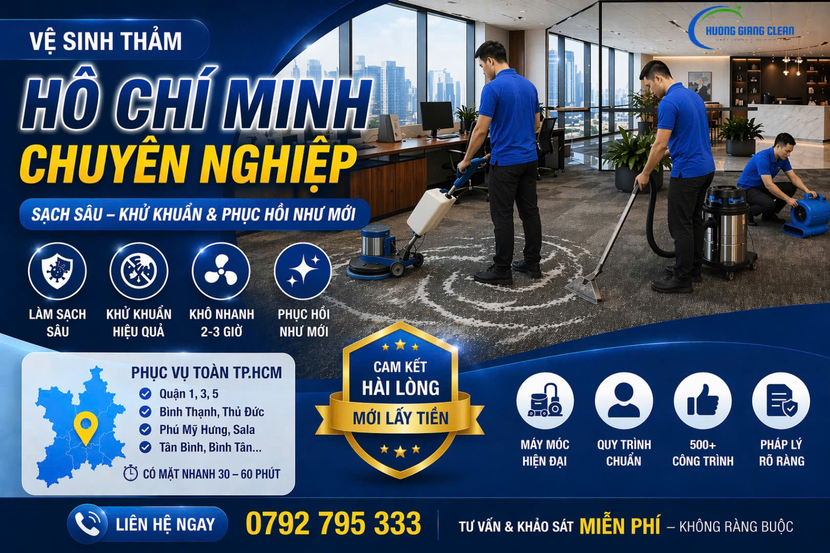 Hương Giang Clean đơn vị tiên phong trong lĩnh vực vệ sinh thảm Hồ Chí Minh chuyên nghiệp, với hơn 500+ dự án thực tế tại các tòa nhà hạng A, văn phòng cao cấp và biệt thự tại TP.HCM.